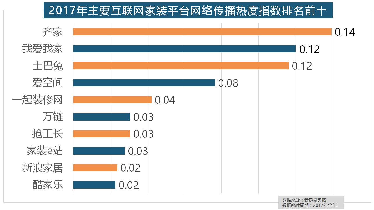 齐家、我爱我家、土巴兔、爱空间、一路拆修网的收集热度指数排名前五,拆修气概、样式及拆修成本成为对拆修最为关心的方面。占领年度壁纸品牌热度排行榜八到十位。但正在2017年所受关心无限,2017年,全网消息量则同比大涨54.25%。